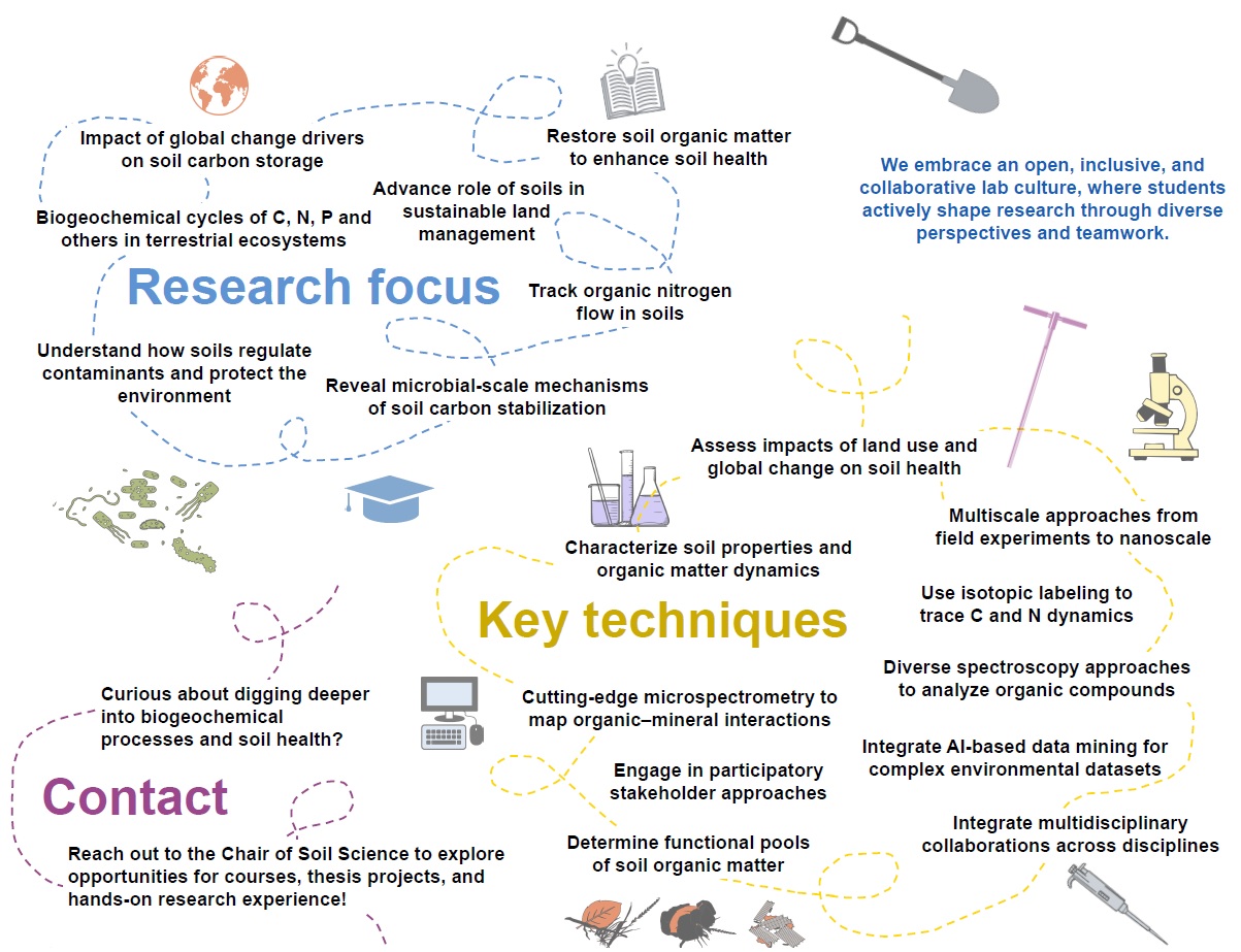 Soils are key players in the global carbon cycle and contribute significantly to the regulation of biogeochemical processes and the stability of ecosystem functions. At the Chair of Soil Science, we investigate how soil organic matter drives ecosystem resilience by analyzing biogeochemical processes across scales and fostering interdisciplinary collaboration.