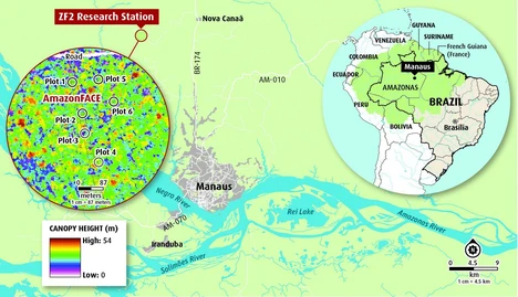 The experiment consists of six 30 m diameter plots, three of which are maintained at ambient CO2 concentrations, and the other three are kept at elevated (+200 ppm) CO2 concentrations for at least ten years. The research site is a plateau at the ZF2 research station, with vegetation and soil representative of a dominant fraction of Amazonia’s forests. Experimental plots comprise stands of 30-m tall trees on deep, well-drained clay Ferralsols.