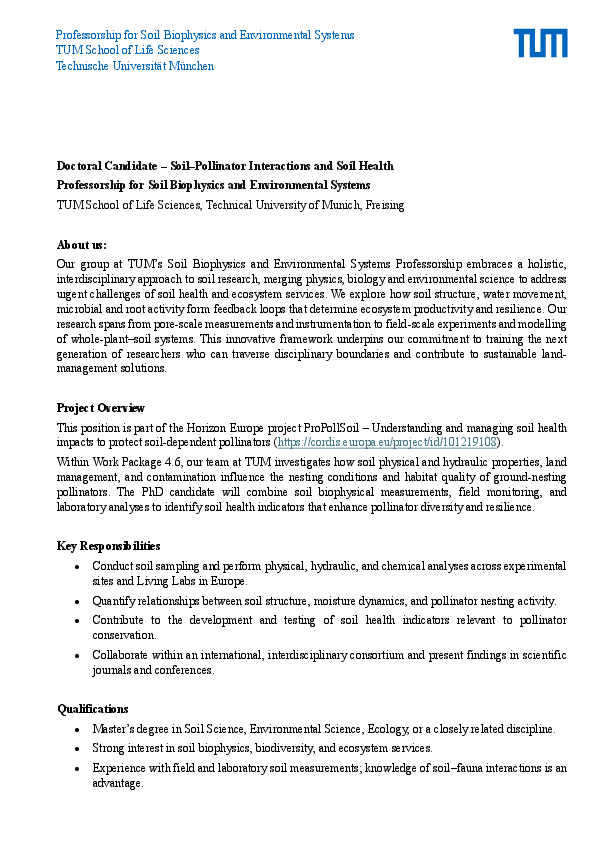 Project Overview: This position is part of the Horizon Europe project ProPollSoil – Understanding and managing soil health impacts to protect soil-dependent pollinators.