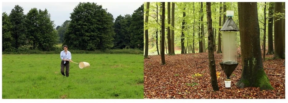 Insekten und Spinnen werden seit 2008 jährlich im Juni und August auf 150 Grünlandflächen mittels standardisierter Kescherfänge erfasst (Abbildung 1a). Im Wald werden Flugfensterfallen eingesetzt, die fliegende Insekten über die gesamte Vegetationsperiode, von März bis Oktober, sammeln (Abbildung 1b). Für 30 Waldbestände liegen jährliche Daten von 2008 bis heute vor. Weitere 110 Waldbestände werden im Abstand von drei Jahren beprobt, d.h. 2008, 2011, 2014, 2017, 2020, 2023 und demnächst 2026. So können Trends in den Insektenbeständen über eine größere Anzahl Flächen hinweg getestet werden.
