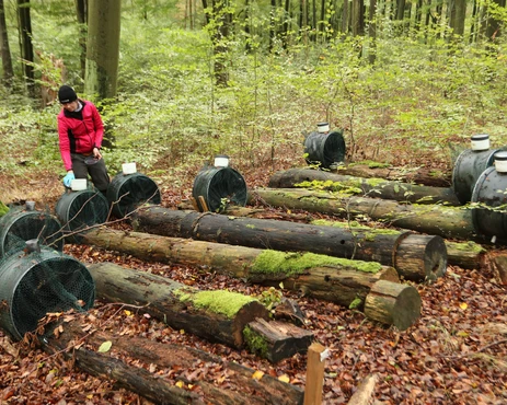 Unsere Gruppe ist auch für die Koordination des BELongDead-Experiments verantwortlich, das in den 30 „VIP“-Parzellen (Very Intensive Plots) in den drei Biodiversitäts-Exploratorien durchgeführt wird. Auf Initiative von Ernst-Detlef Schulze vom Max-Planck-Institut für Biogeochemie in Jena wurden 2010 Baumstämme (Durchmesser 30–40 cm, Länge 4 m) von 13 verschiedenen Baumarten in dreifacher Ausfertigung in jeder der Parzellen ausgelegt. Seitdem untersuchen wir die Besiedlung dieser Baumstämme durch Insekten mithilfe von Emergenzfallen. Andere Gruppen des BELongDead-Konsortiums untersuchen Pilze, Milben, und andere Organismen, die an den Stämmen leben oder die Zersetzung von Baumstämmen, z. B. den DOC-Fluss. Das einzigartige Experiment ermöglicht es, den Einfluss der Baumarten vom Einfluss des umgebenden Waldes auf die Gestaltung der Gemeinschaften, die Totholz nutzen, und auch auf die Zersetzung des Holzes zu trennen. Wichtige Ergebnisse betreffen die Analyse artspezifischer Unterschiede im Verfall der Baumstämme im Laufe der Zeit4 und die Entwicklung der Insektengemeinschaften im Laufe der Zeit5.