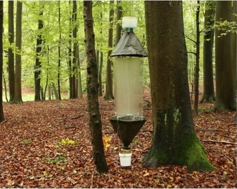 Unser primäres Ziel ist es, die Auswirkungen dieser Mischbestände auf die einheimische Biodiversität zu verstehen, wobei wir uns insbesondere auf die taxonomische und funktionelle Vielfalt innerhalb der Gemeinschaften von Vögeln, Fledermäusen und Insekten konzentrieren. In einer Übersicht haben wir festgestellt, dass frühere Studien nur geringe Auswirkungen der Einführung von Douglasie auf die Biodiversität festgestellt haben, dass aber auch die Anzahl der Studien sehr begrenzt ist6. Wir haben 2023 ingesamt 63 Parzellen (30 Douglasie-Buche, 23 Weißtanne-Buche und 10 Buche-Parzellen als Kontrolle) in Unterfranken (Spessart) eingerichtet, die als Versuchsflächen dienen. Die Mischparzellen repräsentieren einen Gradienten des Nadelbaumanteils innerhalb der Buchenbestände. Wir verwenden Malaise- und Lichtfallen, um die Biomasse und den Artenreichtum von Arthropoden und nachtaktiven Motten zu messen, und setzen Audiorecorder ein, um Vögel und Fledermäuse zu überwachen. Darüber hinaus überwachen wir den Fortpflanzungserfolg von Vögeln mithilfe von Nistkästen.