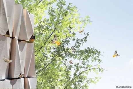 Das Design für Biodiversität erfordert nicht nur neue Planungs- und Designstrategien, sondern auch neue Werkzeuge, die zur Umsetzung biodiversitätsfreundlicher Maßnahmen beitragen können. In Zusammenarbeit mit Kathrin Dörfler, Professorin für digitale Fertigung, wurden das Design für Biodiversität und das Design klimafreundlicher Fassaden in der Doktorarbeit von Iuliia Larikova6 kombiniert. Für die Nest Fassade wurden maßgeschneiderte Keramikelemente entwickelt, deren komplexe Geometrie verschiedenen Tierarten Schutz und Nistmöglichkeiten bietet. Gleichzeitig wurden die Geometrien digital für die Selbstbeschattung der Gebäudehülle optimiert, was insbesondere im Sommer zu einer Verringerung der Oberflächentemperatur der Fassade führt. In München wurde ein Prototype installiert, mit dem getestet werden soll, ob Vögel und Säugetiere ihn nutzen werden.